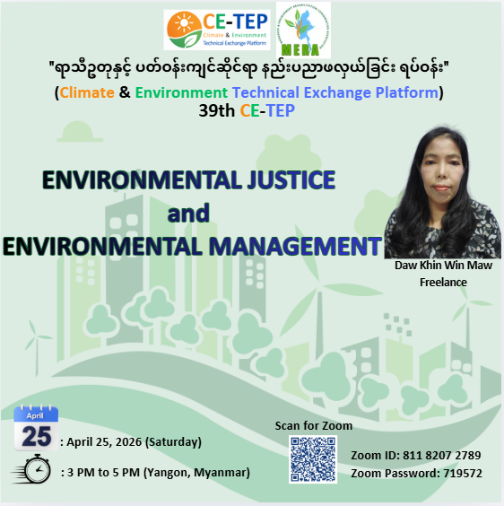 Dear CE–TEP Members, Climate and Environmental Advocates, Mangrove and Environment Rehabilitation-Conservation Association (MERA), formerly known as Myanmar Environment Rehabilitation-Conservation Network (MERN), officially launched the Climate & Environment Technical Exchange Platform (CE–TEP) on 15 June 2024. CE–TEP was established as a professional knowledge-sharing platform to strengthen dialogue and collaboration on climate and environmental issues in Myanmar. Each session fostered dynamic and engaging discussions and debates, where participants actively exchanged diverse perspectives and critical insights on key environmental challenges. Since its inception, the 38th CE–TEP was successfully conducted on 04 April 2026, and its Wrap-up and debrief is presented in the poster below. Please see the following link for the presentation: https://drive.google.com/file/d/1ZCp_e4v1f2w6lYrJItb8wVNFaAKzx4YC/view?usp=sharing If you are not yet a member of CE–TEP, we encourage you to join by filling out the membership form through the link below: https://docs.google.com/forms/d/e/1FAIpQLScfvthK4e0qqrFylnv_0LvuA1Hm1VvVmAQkT_cuXojzz7b5Ug/viewform?usp=sharing For further details regarding the program, don’t hesitate to get in touch with us at the following: ✉Email: mern.myanmar@gmail.com ☎Phone/Viber: Admin Officer: 09456999119 CEO: 09448016358 CE–TEP Team: 09264542041 Stay updated with CE–TEP by following: 🌐 MERA’s Website: http://mernmyanmar.org, 📢 Telegram Channel: https://t.me/cetep2024, 📘 Facebook Page: https://www.facebook.com/mernmyanmar?mibextid=ZbWKwL Thank you for your attention, and we look forward to your participation. Best regards, MERA CE–TEP Team
