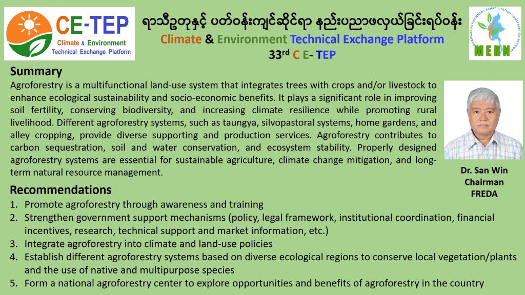 We would like to share that the 33rd CE–TEP Session was successfully held with the topic “Agroforestry Systems: Enhancing Livelihood Resilience in a Changing Climate”. A total of 44 participants actively contributed to insightful discussions, exchanging ideas and recommendations on this topic.